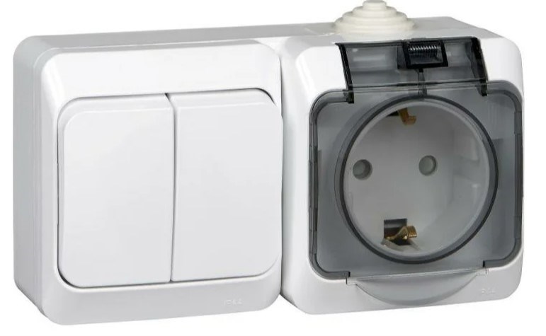 Блок накладной состоящий из розетки с заземлением с крышкой IP 44 и двухклавишным выключателем Schneider Electric Этюд (открытой установки), с изолирующей пластиной предназначена для сетей до 250В, на ток до 16А. Изготовлен из ABS-пластика, прост в установке и удобен в применении. Изделия серии Этюд- отличное решение для города и дачи.