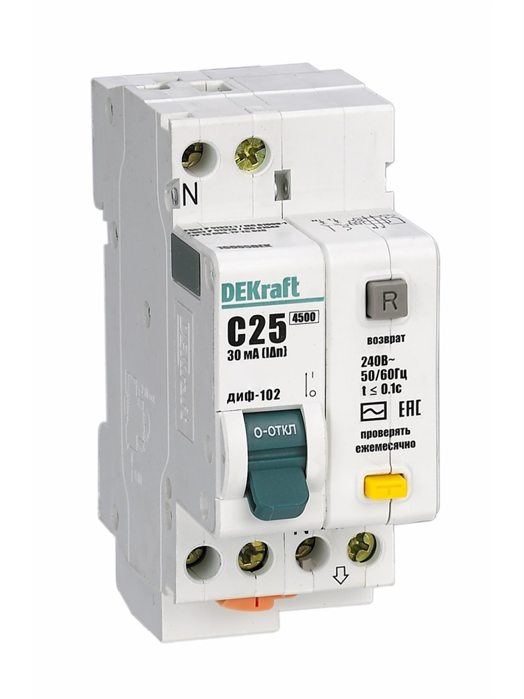 Дифф. автомат 2Р 25А 30мА 4,5кА 1Р+N С ДИФ-103 DEKraft