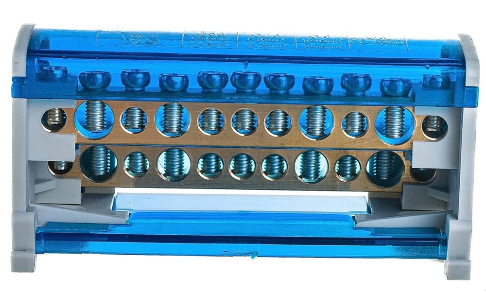 Кросс модули изготавливаются с двумя или четырьмя шинами, которые имеют отверстия различного диаметра и рассчитаны на токи до 100 и 125А. Шины закреплены в корпусе, который имеет возможность крепления на DIN-рейку 35мм или нп монтажную панель щита с помощью двух винтов.