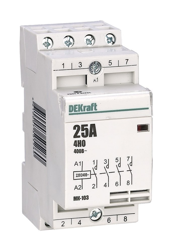 Модульный контактор серии МК-103 DEKraft; ном.ток 25 А (АС-7а); кол-во и исполнение контактов and ndash; 4НО; напряжение управления 220 В пер.тока; ширина and ndash; 2 мод. х 18 мм; установка and ndash; на DIN-рейку. Контакторы МК-103 применяются в сетях напряжением до 400 В пер.тока для дистанционного управления небольшими нагрузками, требующими большого количества включений / отключений, например, насосы, системы вентиляции и т.п. Модульные контакторы не требуют дополнительных настроек и специального обслуживания.